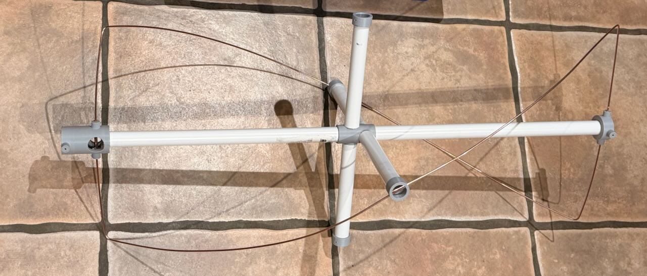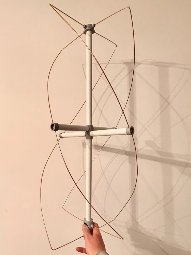 QFH dimensions at 137.5 MHz (from John Coppens' calculator at jcoppens.com): Total helix height: 721 mm The antenna consists of two loops — one large and one small — wound as a helix around a central PVC pipe, offset 90 degrees from each other. The size difference between the loops creates the phase quadrature (90° phase relationship between the two loops) that generates circular polarisation. Electrically, the two loops form a single continuous conductor path from coax centre conductor to coax braid, twisted around the pipe.